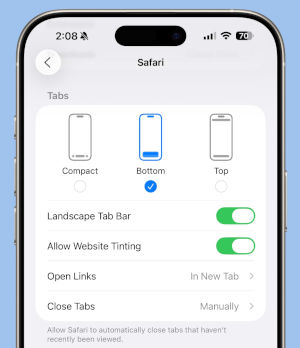 * Nota: Si actualizó a la última version iOS, se va a → App´s y da click → Safari, luego click → ¨BOTTOM¨✓ — Va a quitar el menú ¨COMPACT¨ (aquí le quitan funciones interesantes)